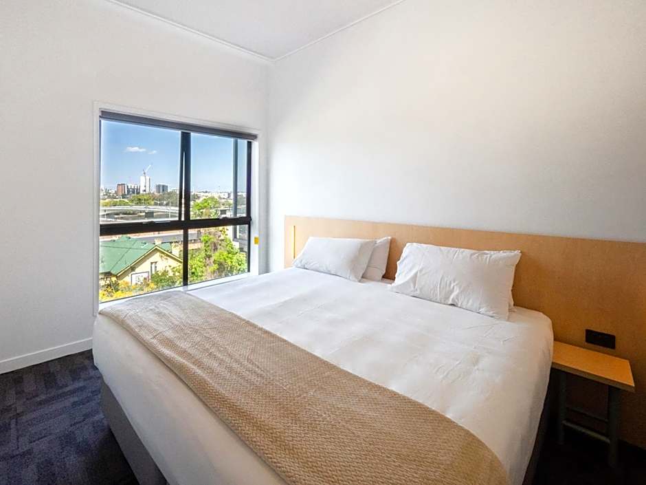 Room with queen bed, views of Brisbane River, ensuite, 50-inch Smart TV, air conditioning, free WiFi, kettle with tea and coffee, towels and linen provided.